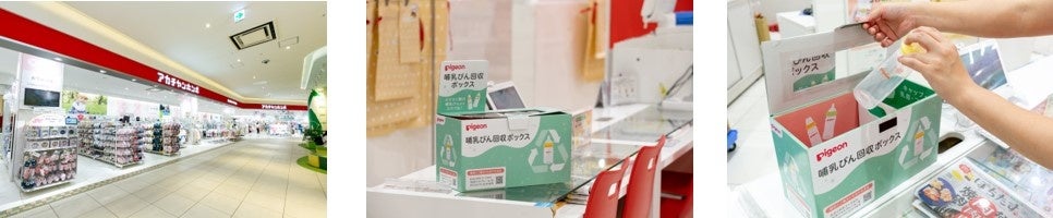 全国のアカチャンホンポ126店舗に、哺乳器回収ボックスを設置。ご家庭で使わなくなったピジョンの哺乳器を持ってきていただき、回収ボックスでお預かりします。