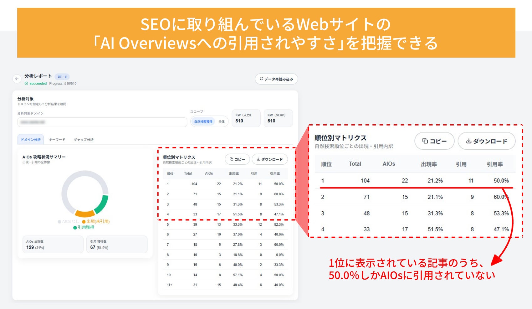 本機能では、SEOに取り組んできたWebサイトの「AIOsへの引用のされやすさ」を把握できます。これにより、サイト構造や既存コンテンツの改善が必要かどうか、判断することが可能となります。