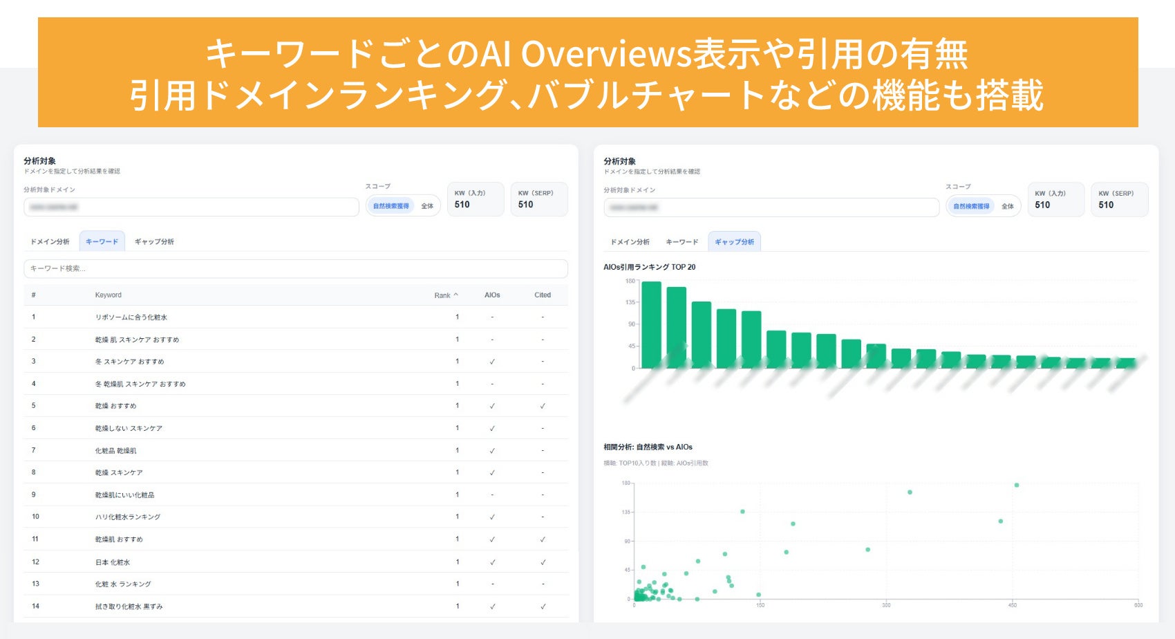 自社・競合サイトがGoogleのAI Overviewsでどれくらい引用されているか、状態を可視化。SEOに取り組んできたサイトがAIフレンドリーか否かを把握することが可能になりました。