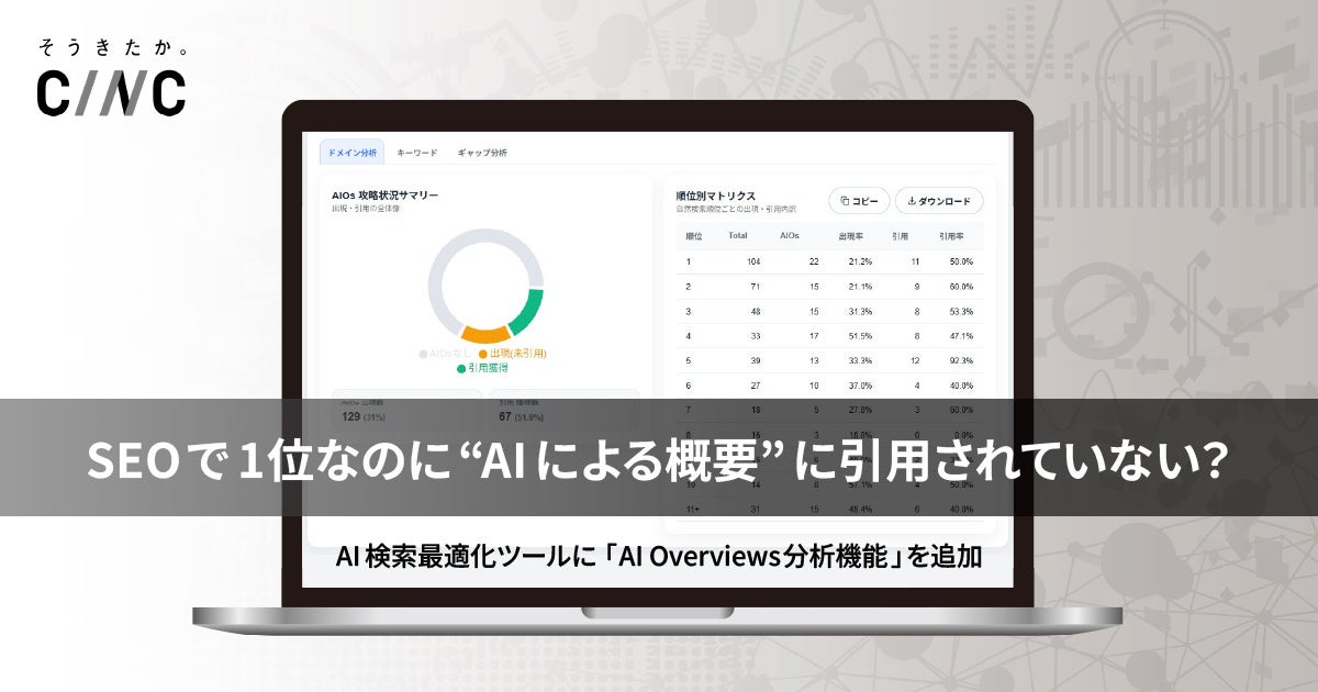 株式会社CINC(本社:東京都港区、代表取締役社長:石松友典、以下CINC)は、独自開発のAI検索最適化(GEO/LLMO)ツールに、AI Overviews(AIによる概要。以下、AIOs)の表示有無およびドメインの引用状況を分析できる機能を追加しました。