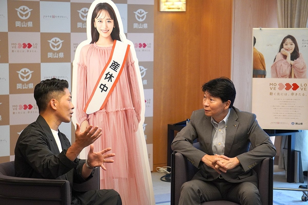 このたび、「おかやま縁むすびネット」を広く周知するとともに、結婚気運の醸成を図るため、おかやま結婚応援アンバサダーにモデル・タレントの近藤千尋さんを任命しました。岡山県出身であることや、「勇気を持って一歩踏み出すことで、素晴らしい出会いに巡り合えた」という近藤さんの実体験が、結婚を希望される方への応援メッセージになると考えての起用です。アンバサダー就任に際し、産休中の近藤千尋さんに代わって、夫でお笑い芸人のジャングルポケット太田博久さんが8月20日(火)に行われた就任式に登場しました。