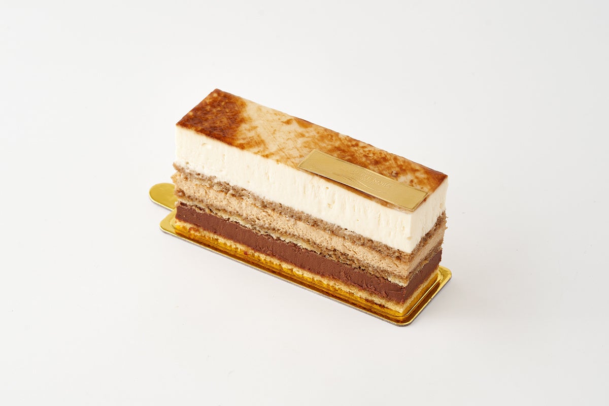 コーヒーとマルサラ酒で香りづけしたシロップを染み込ませたアーモンド生地に、マスカルポーネチーズのムース、コーヒーのクリーム、ガナッシュを重ねました。