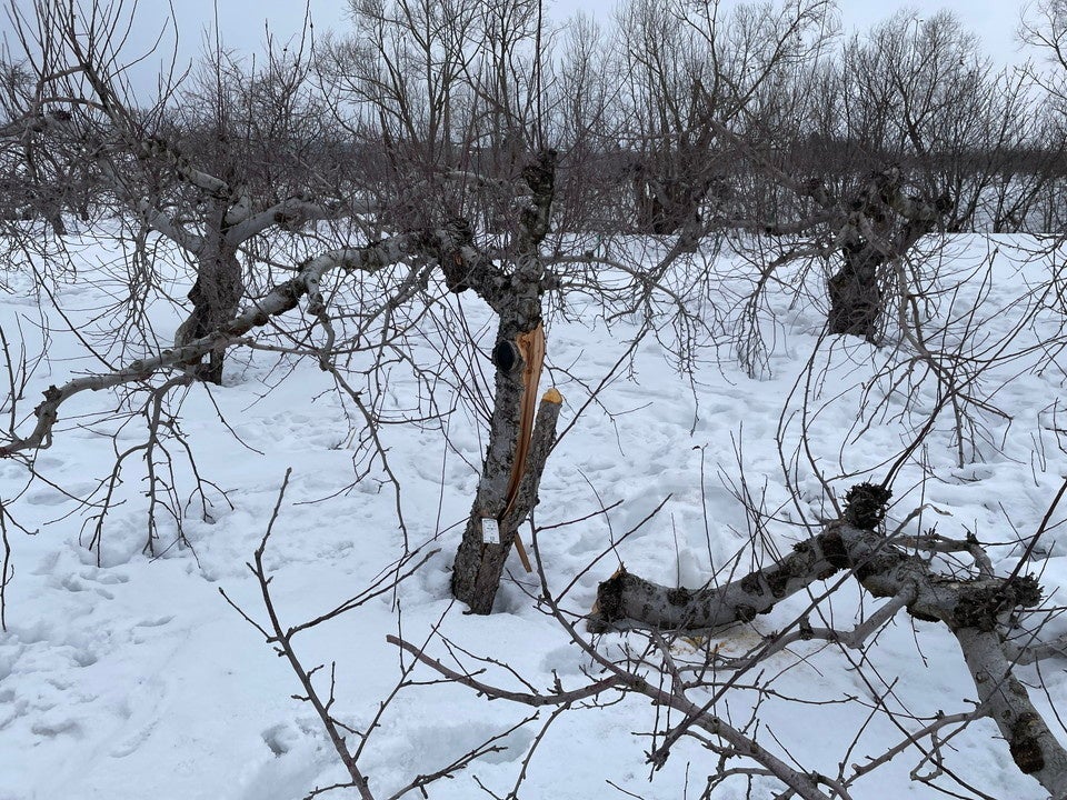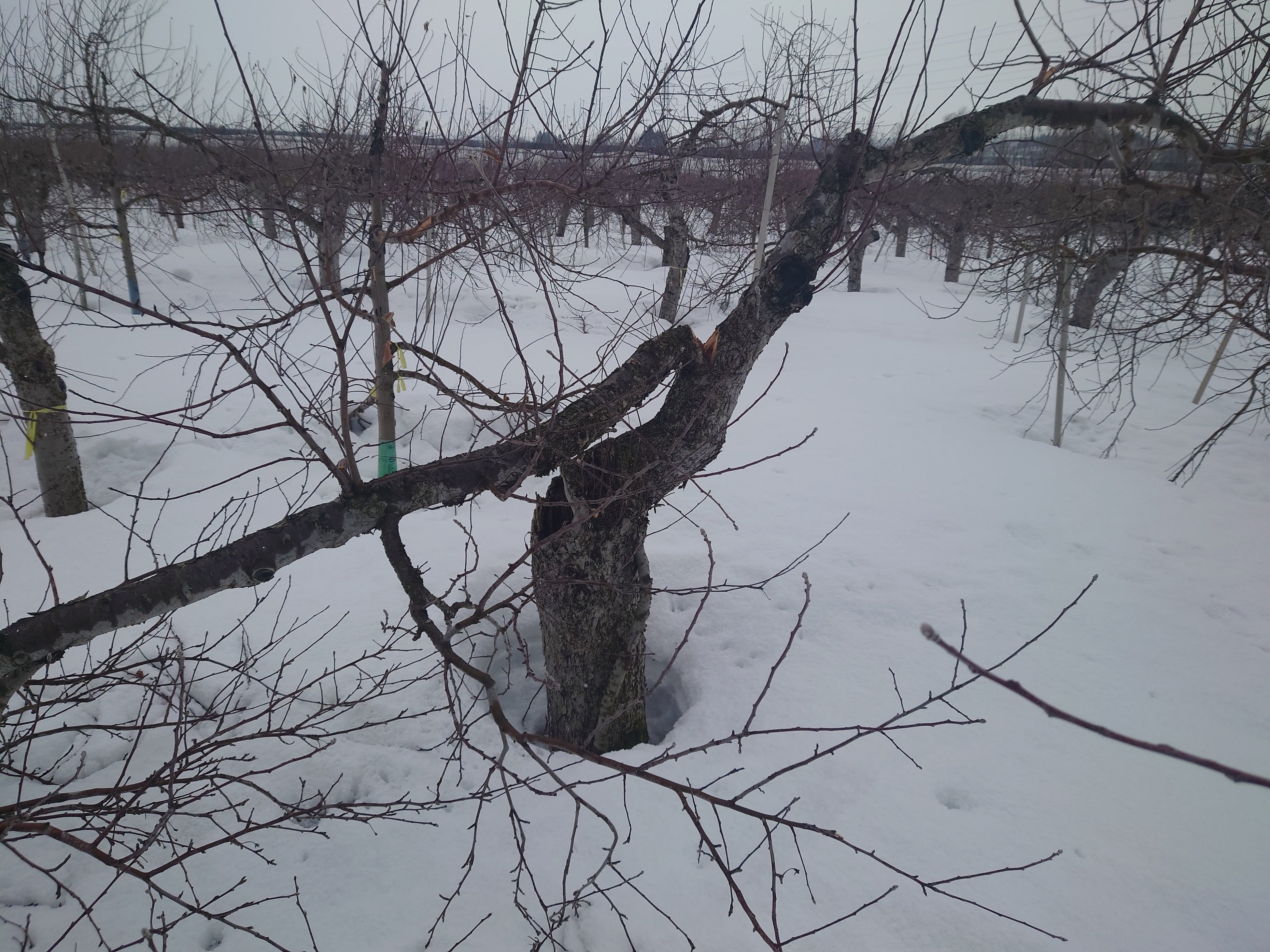 りんごの樹の太枝が雪の重みと沈降で裂傷し、若木も雪の沈降で裂傷してしまいました。地熱で地面と雪の間に隙間ができ、地上60㎝位までねずみの食害が出ています。
