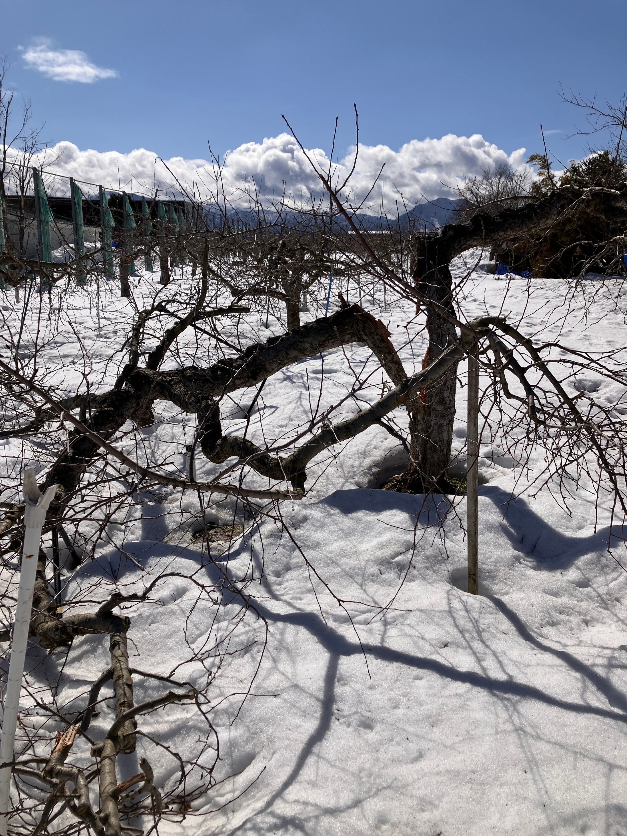 年始から豪雪となり、梨棚やラ・フランスが雪害にあいました。一番ひどいのは梨棚で棚のワイヤーと線が切れてしまい、自力での修理にかなり時間と費用がかかります。