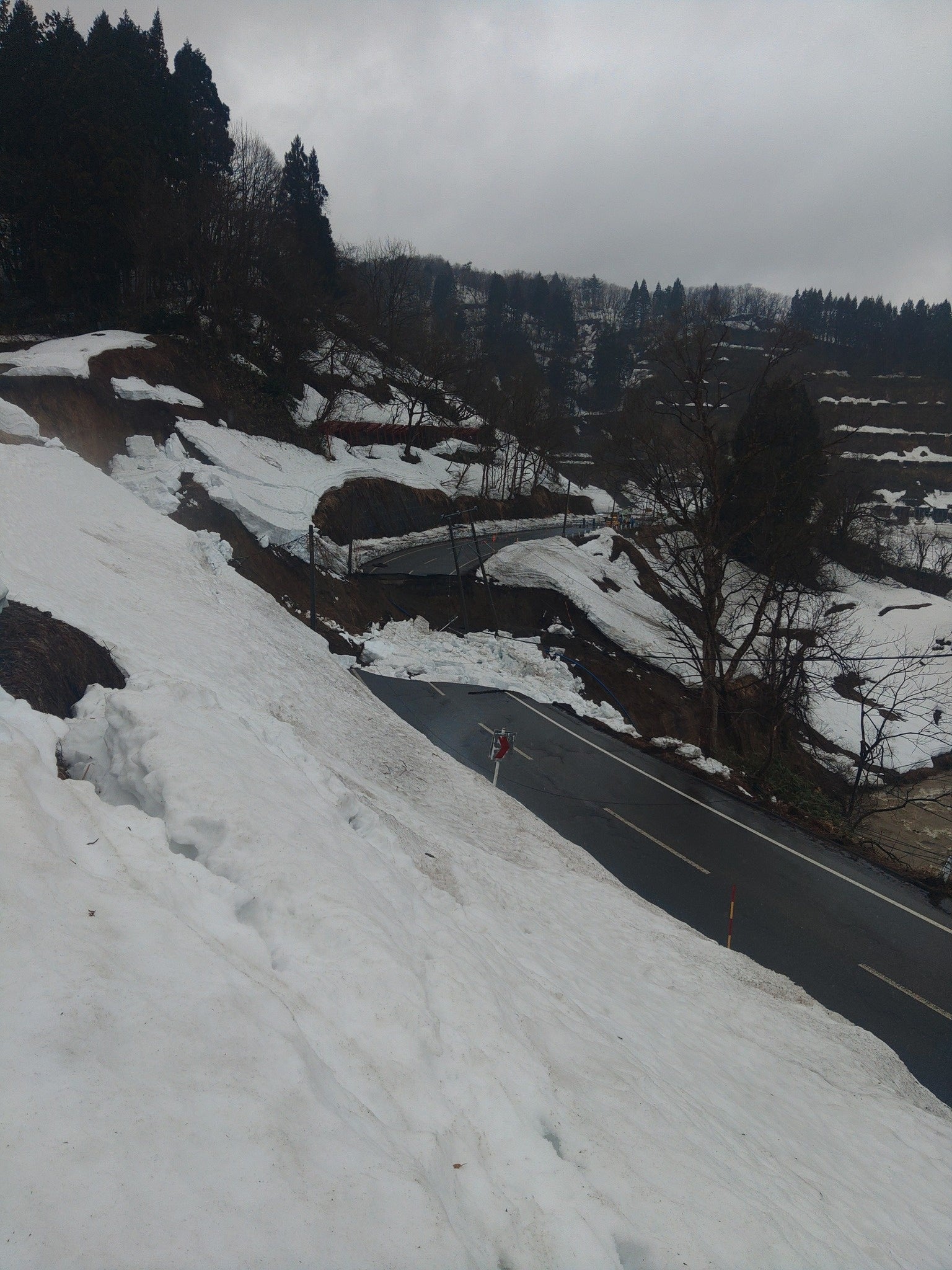 山間地のため、雪が消えないと分からないですが、田んぼへの道に杉の倒木があり、通れない状況です。また、融雪水による山崩れを心配してます。