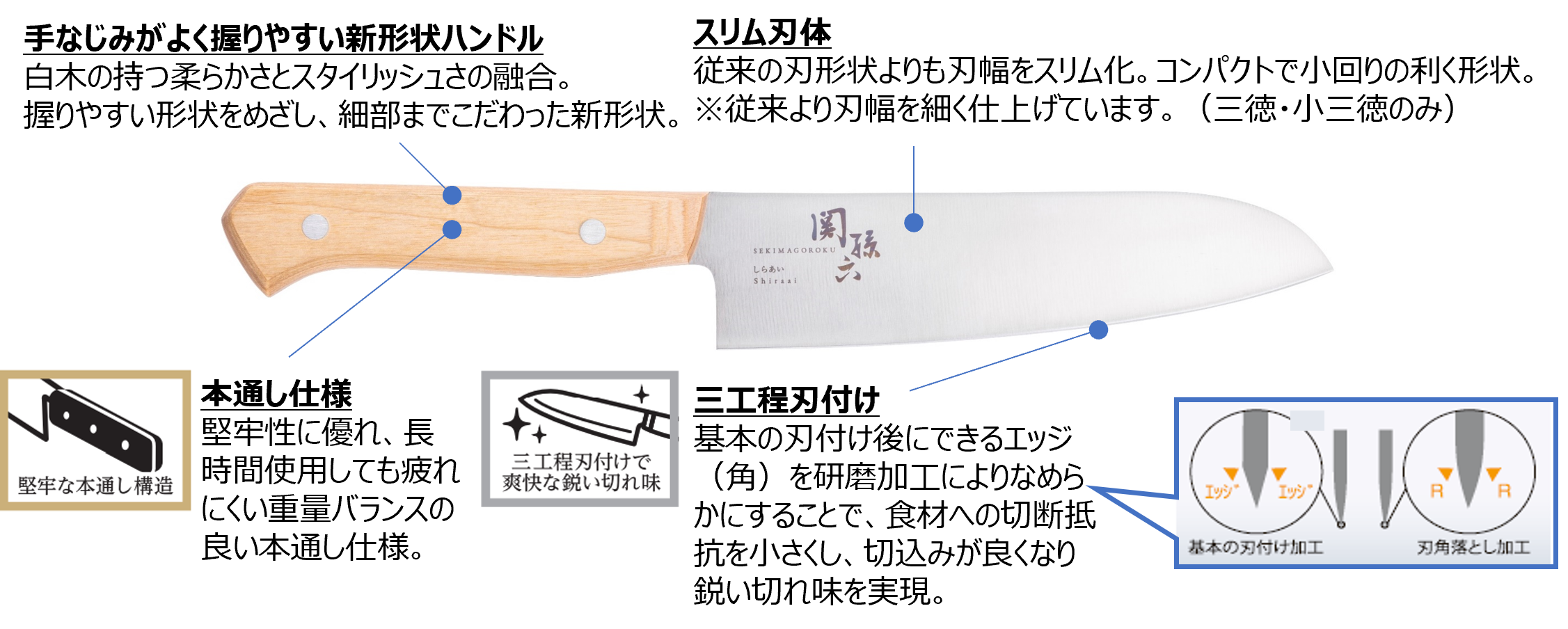 今回新発売となる関孫六「しらあい」はハンドルに白木を使用することで柔らかさとスタイリッシュさを融合。ハンドルは、指がかりが良く、握りやすさにもこだわり、手にフィットするデザインです。また、鋼材を柄の最後まで通す本通し仕様なので丈夫で、長時間使用しても疲れにくい作りとなっています。加えて、三徳・小三徳の刃は従来より刃幅を細く仕上げることで、コンパクトで小回りが利く普段使いに適したな包丁となっています。刃付けは三工程刃付けを採用。基本の刃付け後にできるエッジ(角)を研磨加工によりなめらかにすることで、食材への切断抵抗を小さくし、切込みが良くなり、鋭い切れ味を実現します。