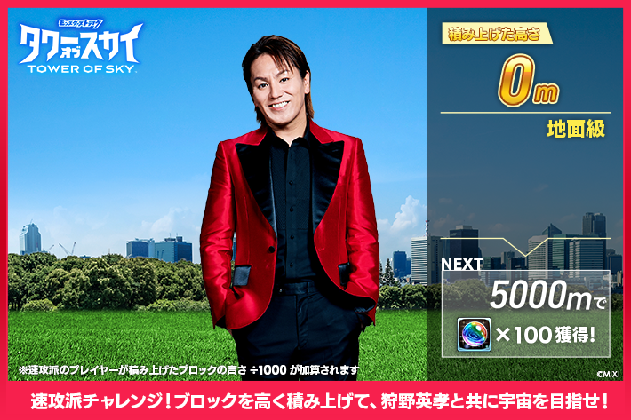 【内容】 「タワスカ」で積み上げたブロックの高さで、狩野 英孝さんを宇宙まで届けよう