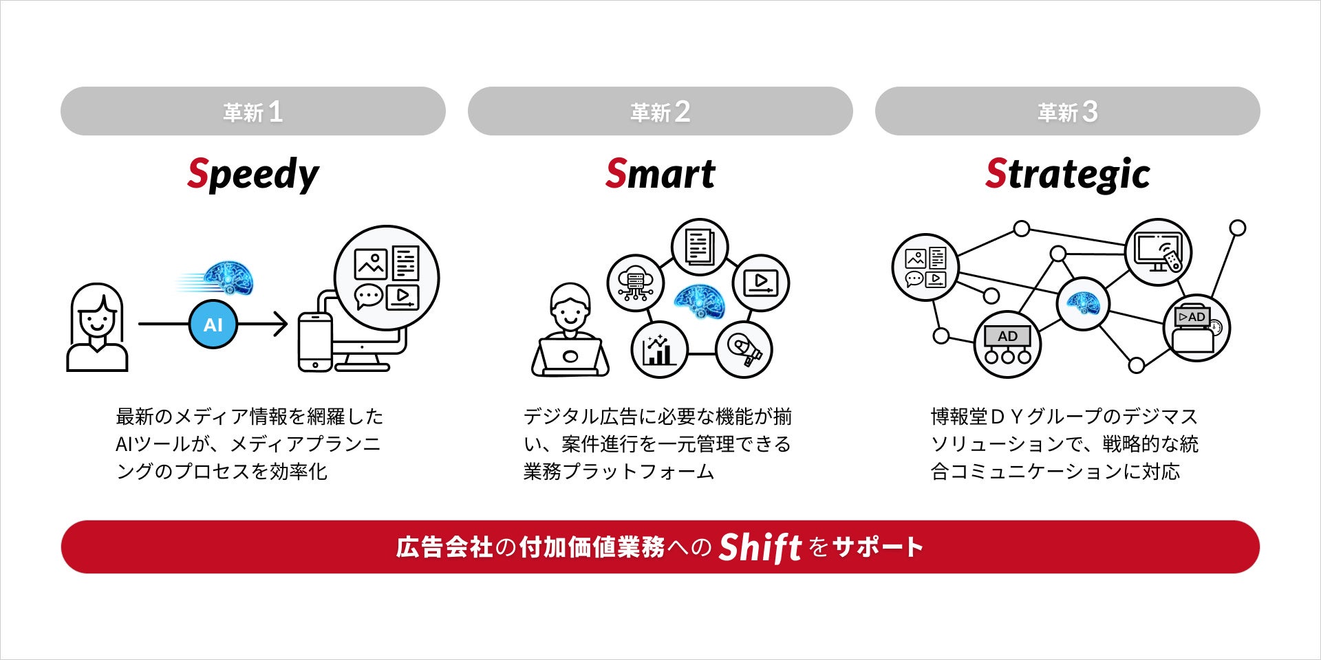 こうした状況を踏まえ、当社は、Hakuhodo DY ONEとともに「S-ONEプロジェクト」を立ち上げ、広告会社が直面する業務効率化と競争力強化の課題解消を目指し、 “3つの革新(Speedy・Smart・Strategic)を柱としたサービス統合を行います。これにより広告会社各社のメディア業務全般を効率化し、より戦略的かつ創造的な業務へのシフトをサポートすることで、各社の事業成長に貢献します。