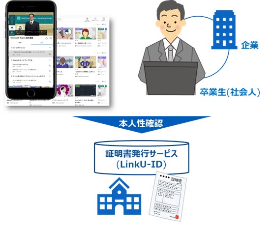 証明書発行サービスが持つ「LinkU-ID」認証サービスの最大の特徴は、ここで認証をすることでその大学の卒業生であることを保証(卒業生本人性確認)できる点です。LinkedInラーニングを同サービスで認証させることにより、京都先端科学大学は、在学生と同じ条件(履歴の保持・アカデミック価格)で、LinkedInラーニングを卒業生へ提供することが可能となります。これまで企業のニーズに応えてきた京都先端科学大学は、卒業生に対してこの仕組みを用いることで、同大学を卒業したメリットをもたらすとともに、実践力の向上・リスキリングを支援します。