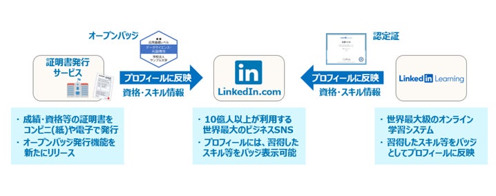 認定スキルの情報を証明書発行サービスへ取り込むことで、学生は同サービスを使って、コンビニでの証明書印刷、企業への電子ファイルとしてのオンライン送付、およびオープンバッジ発行が可能となります。また、オープンバッジは、LinkedIn.comと連携することで、世界へ発信できます。京都先端科学大学では、工学部の新入生の半数は留学生で、50ヶ国以上からの多種多様なグローバル環境が構築されています。LinkedInラーニングは13言語でコンテンツが提供され、24言語で視聴が可能という点で同大学に適しており活用が期待されます。