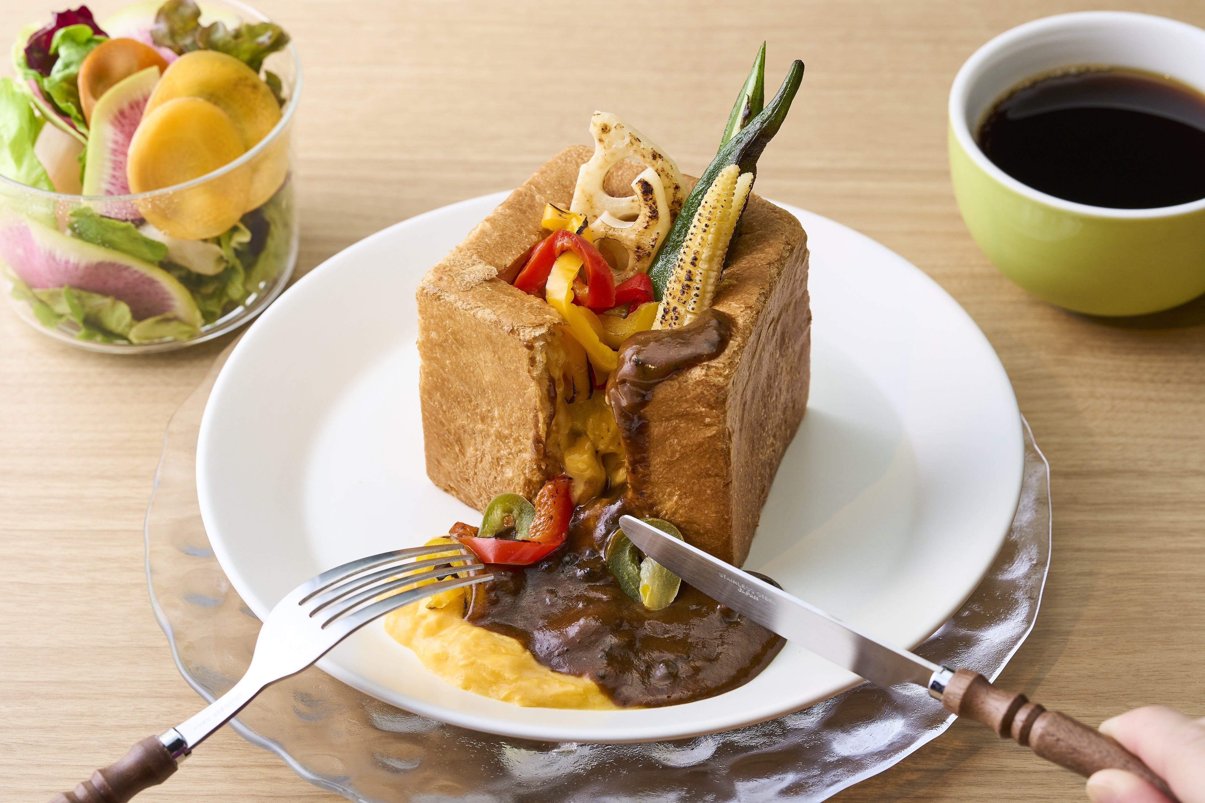 なめらかなスクランブルエッグとモッツァレラチーズを中に詰め、ヤングコーンやパプリカ、オクラのグリルをトッピングしたキューブ型のトーストに、カレーソースをかけて楽しみます。カレーソースには、ゴーゴーカレー特製の濃厚なカレールーを使っています。ゴーゴーカレーの特徴は、55の工程を5時間かけてじっくり煮込み、さらに55時間寝かせて旨みを熟成させていること。本メニューでは、その独特な香りと旨みをそのままに、優しい味わいにして仕上げました。洋朝食と言えば、パンとスクランブルエッグ。そこにたっぷりの野菜と、アクセントとしてスパイスのきいたカレーソースを加えることで、定番と新感覚を組み合わせます。金沢のソウルフードを味わいながら、朝からエナジーチャージできる朝食メニューです。