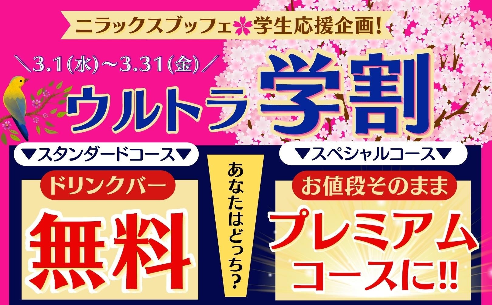 【🌸お得に食べ放題!春の全力学生応援企画!🌸】ニラックスブッフェ26店舗にて「ウルトラ学割キャンペーン」を開催!バラエティー豊かな食べ放題をお得に満喫!