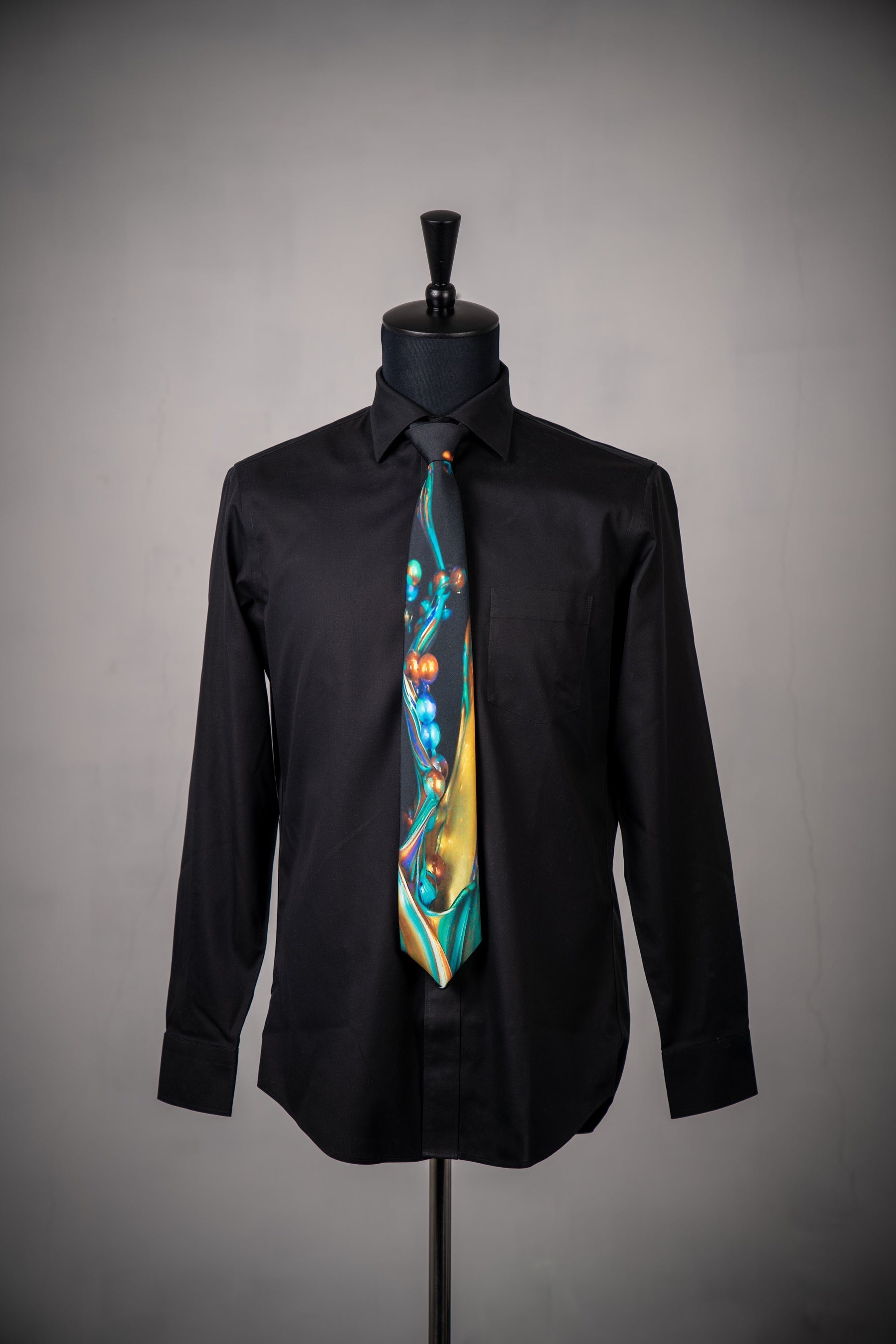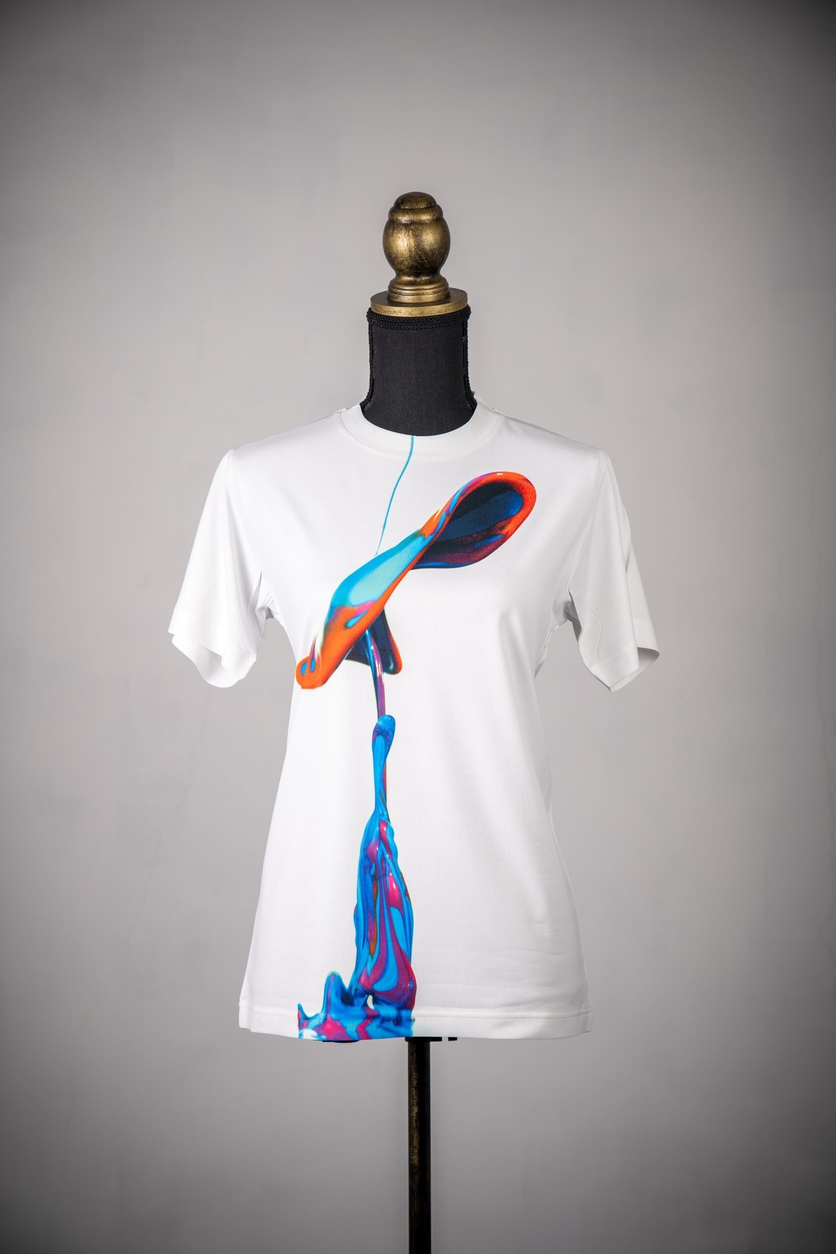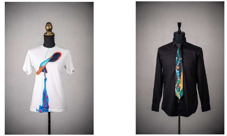 ・「Sound of Ikebana」は、音の振動によってさまざまな表情を見せる液体をハイスピードカメラで撮影し、目に見えない現象の中に潜む一瞬の美:「Invisible Beauty」を音の花・生け花として捉えたアート作品です。本展では⼤画⾯プロジェクションを⽤いた映像作品の展⽰に加え、本アートをデジタル捺染技術でSound of Ikebana Fashionに展開したシルクタイ、カットソー、シャツの展示を行います。