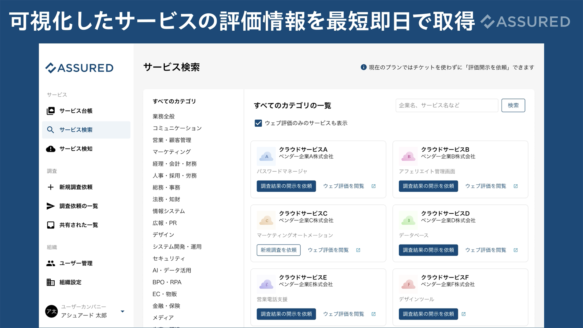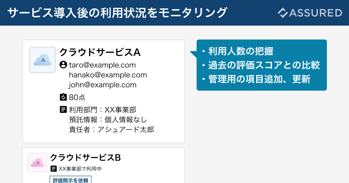 2022年1月の正式リリースから約1年が経過し、先日発表の通り(https://prtimes.jp/main/html/rd/p/000000445.000034075.html)、掲載サービス数が1,000件を超えるプラットフォームへと成長して参りました。そんな中、お客様から「利用申請漏れがないか不安」「利用開始後の管理ができていない」「利用サービスを可視化し、Assuredの評価情報と突合させたい」といったお声を多くいただくようになりました。そこでこの度、より包括的なクラウドリスク管理が行えるサービスをご提供すべく、機能拡張をいたしました。