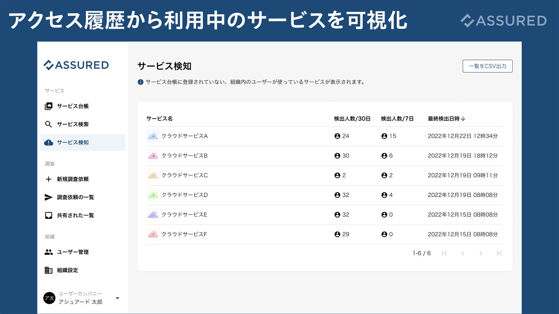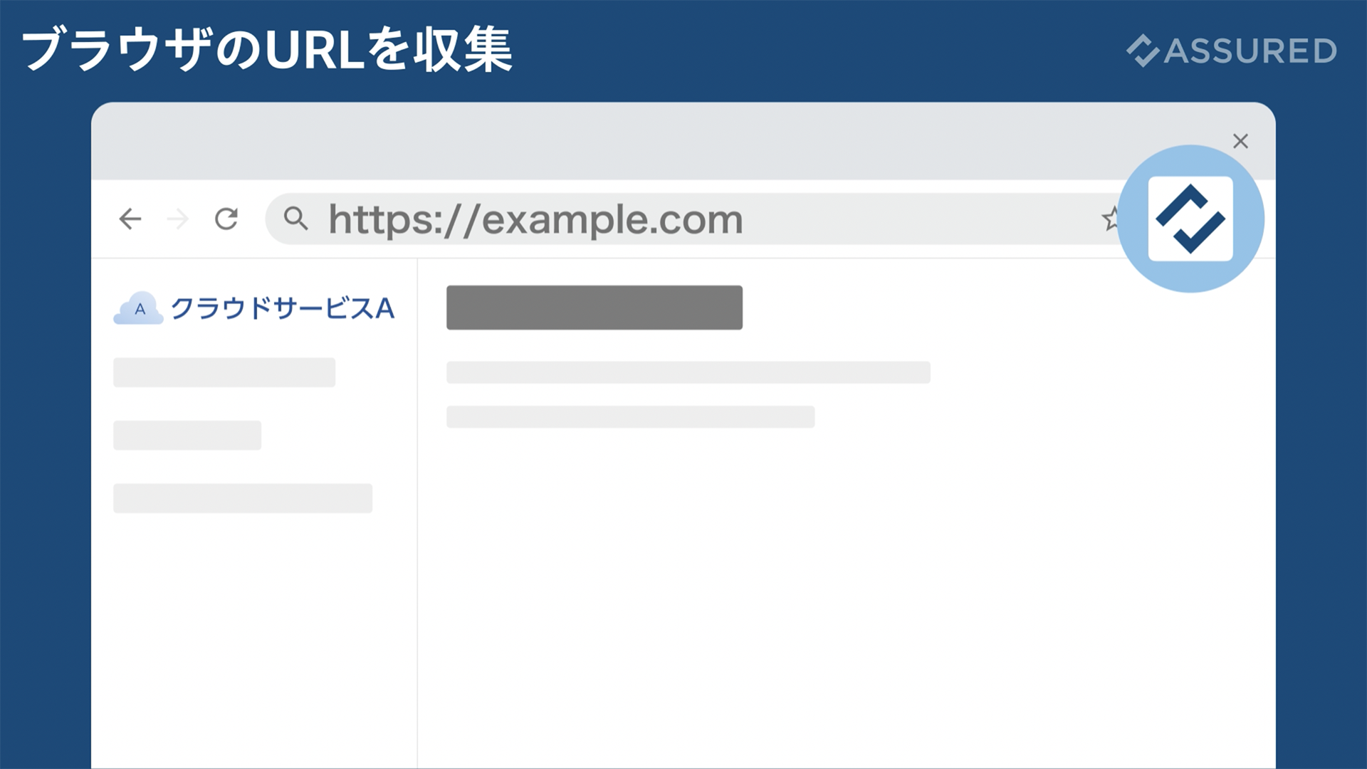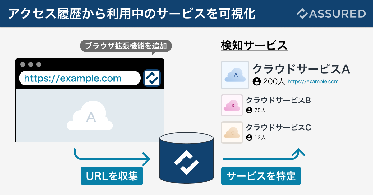 ブラウザ拡張機能が収集したアクセス履歴によるURL情報と、Assured内のデータベース情報を元にサービスを特定し、利用中のサービスを可視化します。