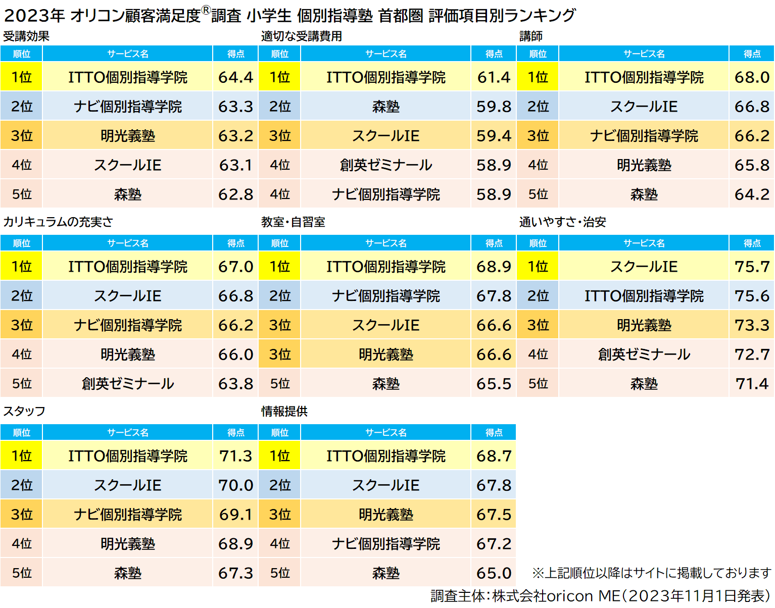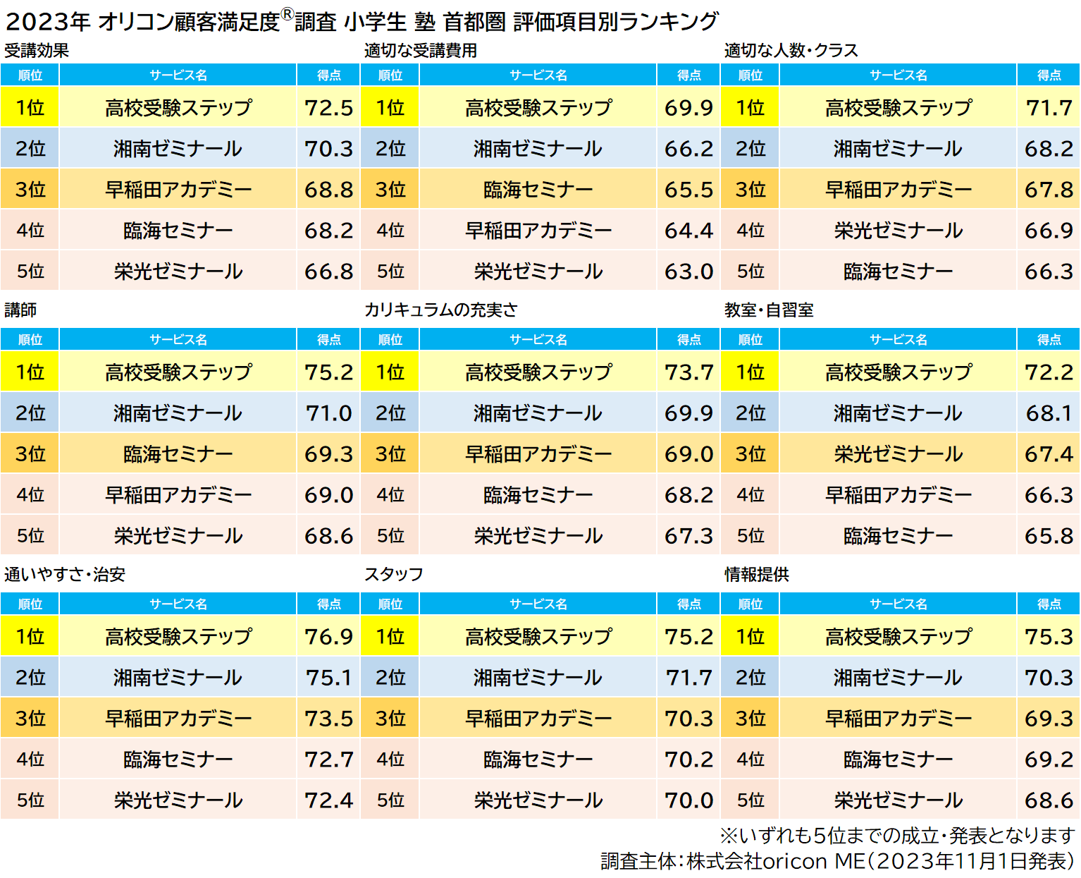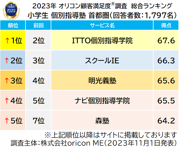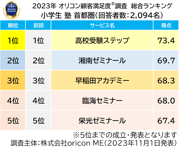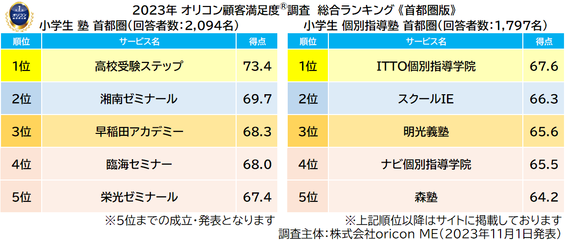 2023年 満足度の高い“小学生向け塾”ランキング《首都圏版》|『塾(集団塾)』高校受験ステップが8年連続の総合1位、『個別指導塾』ITTO個別指導学院が初の総合1位(オリコン顧客満足度調査)