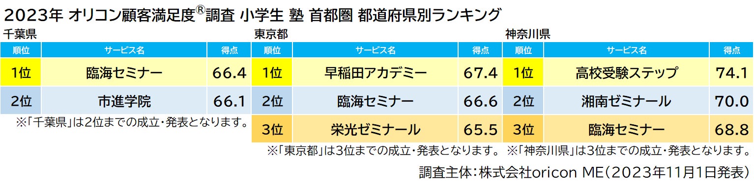 なお、「千葉県」では【臨海セミナー(株式会社 臨海 本社:神奈川県横浜市)】が4年連続1位、「東京都」では【早稲田アカデミー(株式会社早稲田アカデミー 本社:東京都豊島区)】が4年連続1位となっています。「埼玉県」は規定に満たず、ランキング不成立となりました。