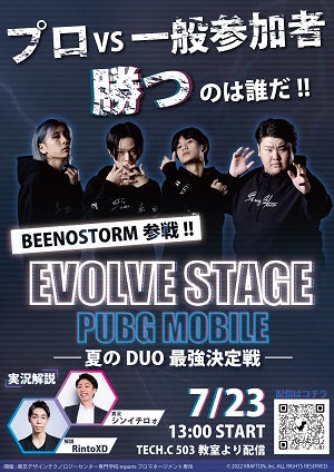 BEENOS株式会社(東証プライム 3328、本社:東京都品川区、代表取締役:直井 聖太、以下BEENOS)のeスポーツ事業を推進する子会社、BeenoStorm(ビーノストーム)株式会社(代表取締役:蓮見 龍馬 以下、BeenoStorm)が運営するプロフェッショナルeスポーツチーム「BEENOSTORM」は、東京デザインテクノロジーセンター専門学校が7月23日(土)、24日(日)に開催する「クリエイターフェス学園祭2022」に登壇いたします。当日は、「EVOLVE STAGE PUBG MOBILE 夏のDUO最強決定戦」のオフラインゲストとして一般参加者と対戦を行います。