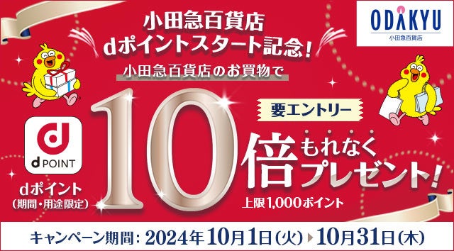 加えて、小田急百貨店でd ポイントがご利用可能になることを記念して、小田急百貨店でのお買い物で d ポイントカードをご提示の上お支払いいただくと、通常の 10 倍のd ポイントを進呈する「小田急百貨店dポイントスタート記念!dポイント10倍キャンペーン」を2024年 10 月 1 日(火)から 10 月 31 日(木)までの期間で開催いたします※3。