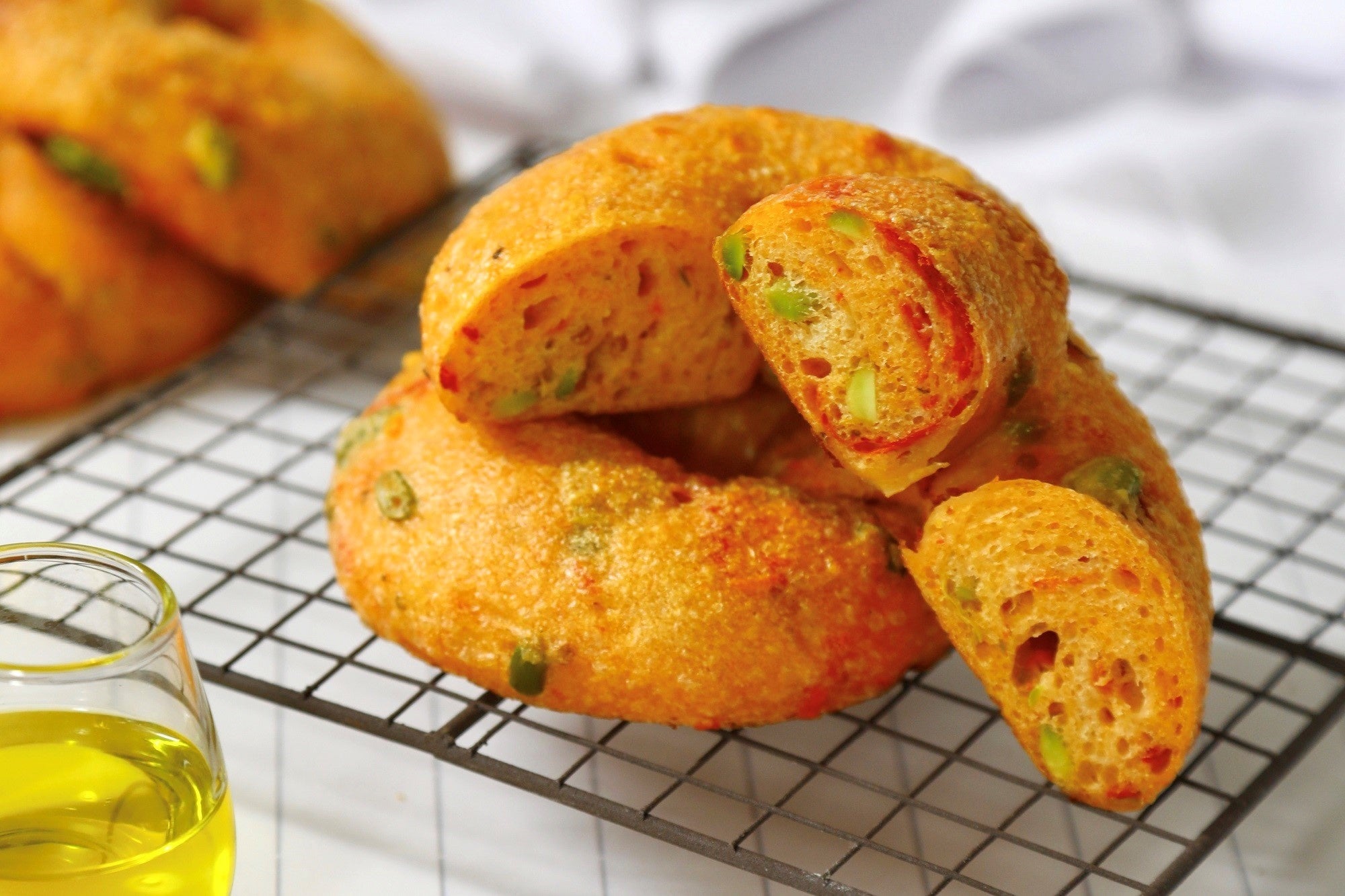 オイル漬けしたドライトマトと枝豆を練り込んだ初夏にピッタリのベーグル。旨味がぎゅっと濃縮されたドライトマトと、彩りと食感の良い枝豆が相性抜群の惣菜パンです。