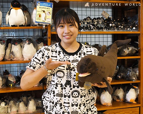 ギフトショップで販売しているオキゴンドウのぬいぐるみには飼育スタッフやギフトショップスタッフのこだわりポイントがつまっているんだって!スタッフに尋ねて調査してみよう!