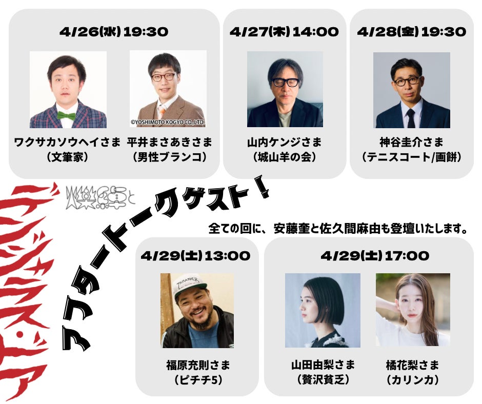 初日となる4月26日(水)19:30には、佐久間麻由が今最も逢いたいお2人、ワクサカソウヘイさん(文筆家)と、平井まさあきさん(男性ブランコ)をお迎えします。2日目、4月27日(木)14:00には、安藤奎と佐久間が大尊敬する、山内ケンジさん(城山羊の会)をお迎え。4月28日(金)19:30には、安藤と佐久間が共にご縁の深い、神谷圭介さん(テニスコート/画餅)を。4月29日(土)13:00には、佐久間が勝手に師と仰ぐ、福原充則さん(ピチチ5)!