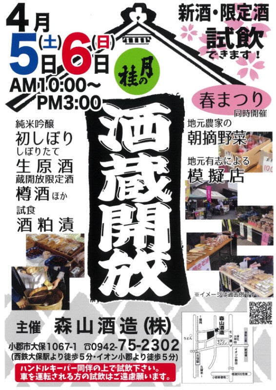 小郡市内唯一の酒蔵「森山酒造」の新酒を楽しむ春のイベント。新酒・限定酒の試飲も楽しめます。春まつりを同時開催。