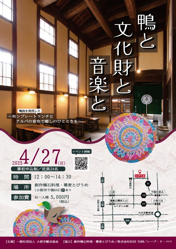 国登録有形文化財を会場に、小郡名物・鴨料理を含む和ンプレートランチと、南米の伝統楽器アルパのコンサートを楽しむ贅沢なイベントです。