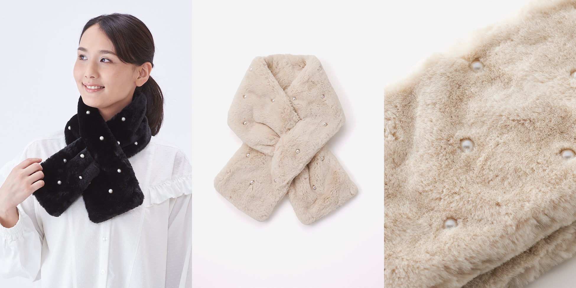 大人の女性にも合わせやすい、程よい艶のパールを散りばめたフェイクファーのティペット。他のファーマフラーアイテム同様、静電気によるまとわりつきやホコリの付着を軽減します。