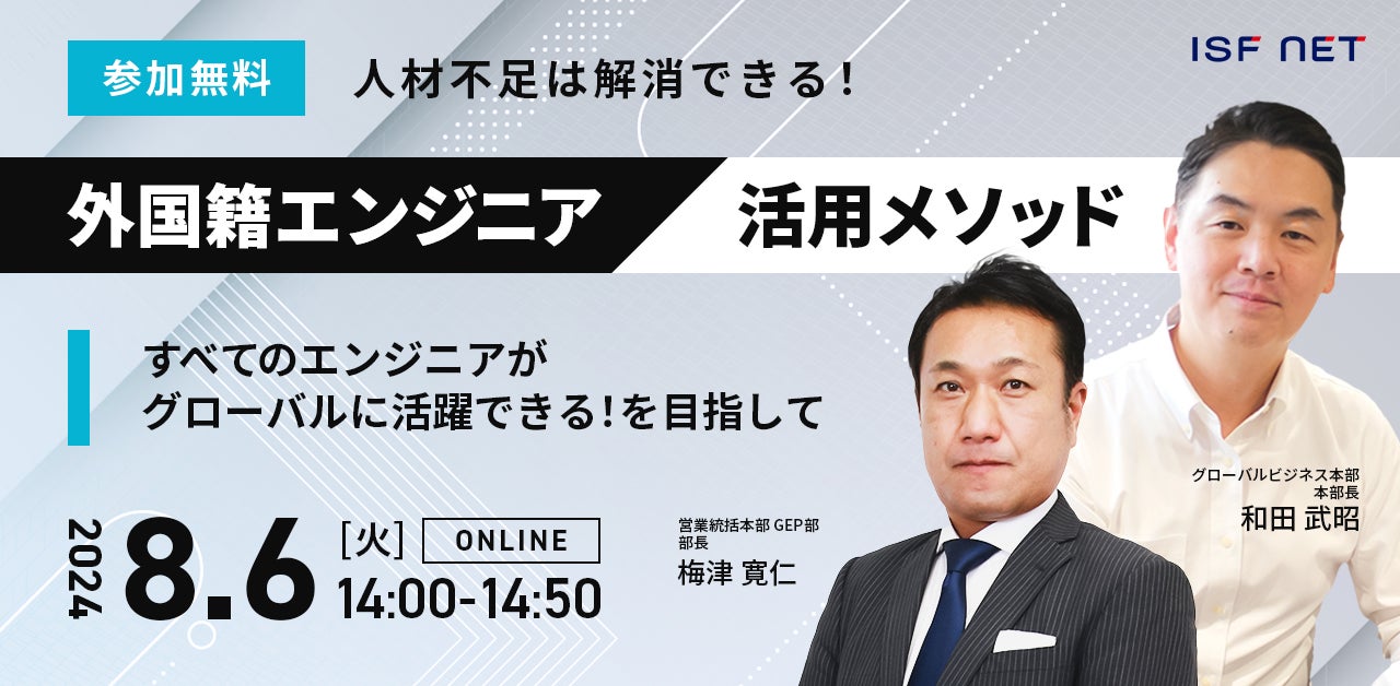 ITインフラソリューションを中心に、クラウド環境や、ネットワークシステムの構築・保守・運用におけるサービスを提供する、株式会社アイエスエフネット(本社:東京都港区、代表取締役:渡邉幸義、社員数:2,520名)は、2024年8月6日(火)の日程にて、「IT人材不足は解消できる!外国籍エンジニア活用メソッド~すべてのITエンジニアが、グローバルに活躍できる!を目指して~」セミナーを開催いたします。