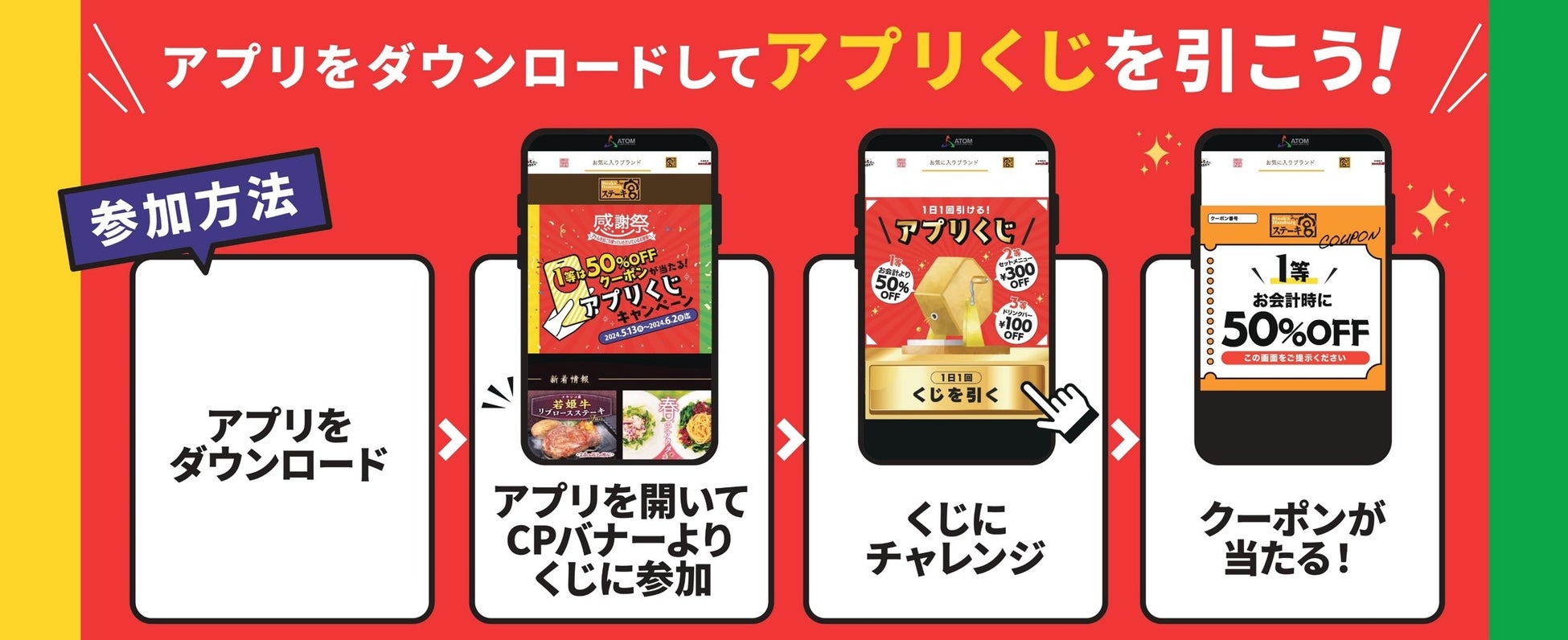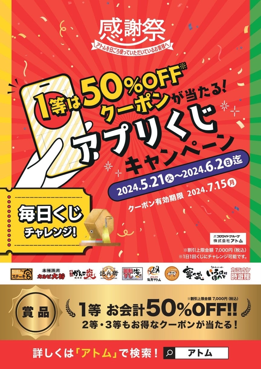 コロワイドグループの株式会社アトム(本社:神奈川県横浜市、代表取締役社長:小島保幸)は、2024年5月21日(火)~2024年6月2日(日)の期間で、「1等は50%OFFクーポンが当たる!アプリくじキャンペーン」を実施いたします。本キャンペーンは、アトム10ブランド(ステーキ宮・カルビ大将・味のがんこ炎・にぎりの徳兵衛・海鮮アトム・海へ・かつ時・寧々家・いろはにほへと・カラオケ時遊館)で運営する“アトムアプリ”で開催いたします。くじチャレンジに挑戦し、1等~3等が当選するとクーポンを獲得できる大変お得なキャンペーンとなっております。なんと、1等は50%OFFクーポン(割引上限金額7,000円(税込))が当たります。くじチャレンジは、毎日!すべてのブランドでチャレンジしていただけます!