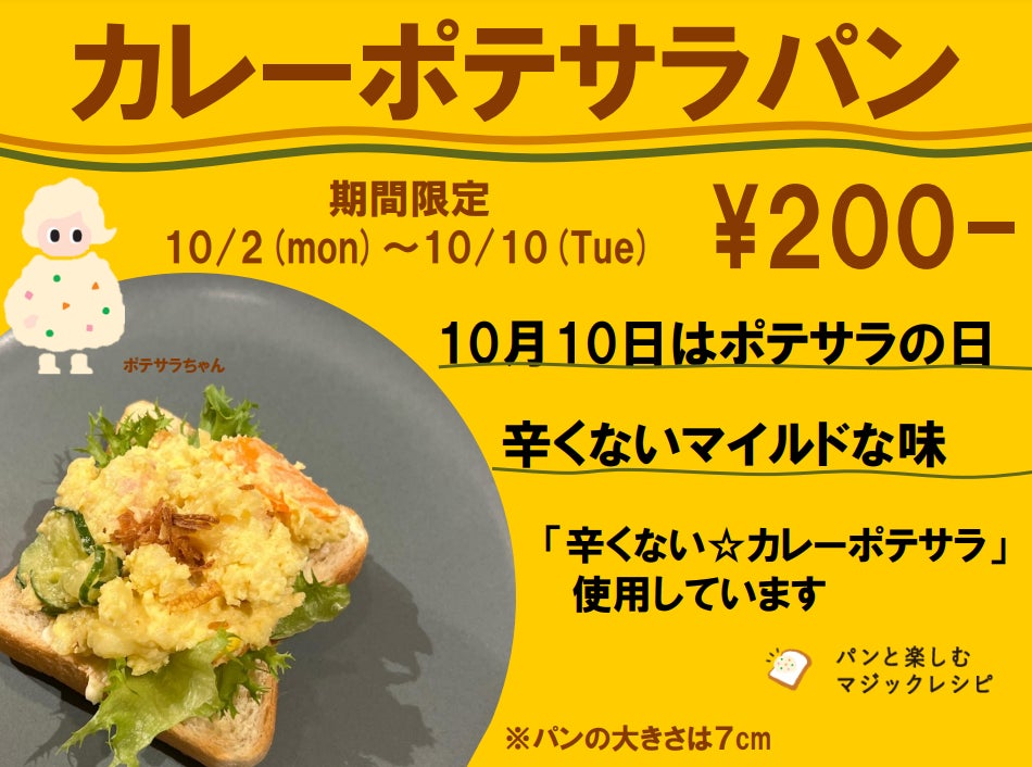 また、10月2日(月)から10日(火)までの期間限定で、株式会社中島董商店(本社:東京都渋谷区、代表取締役社長:中島 周)が運営するカフェ「verde(ヴェルデ)」で「辛くない☆カレーポテサラ」を使用した「カレーポテサラパン」を提供します。