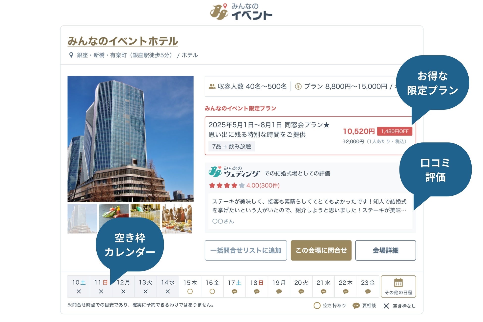 また、従来の会場検索サイトでは「問い合わせをしてみないと、会場の空き状況がわからない」ことも多く、会場候補の絞り込みに時間や手間がかかることも課題でした。「みんなのイベント」では、会場の空き状況がひと目でわかる「空き枠カレンダー」を表示しており、空き状況を確認したうえで検討することができます*。最大10会場まで一括で見積もりを依頼でき、比較検討にも便利です。