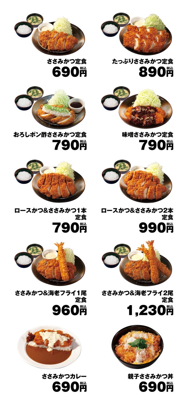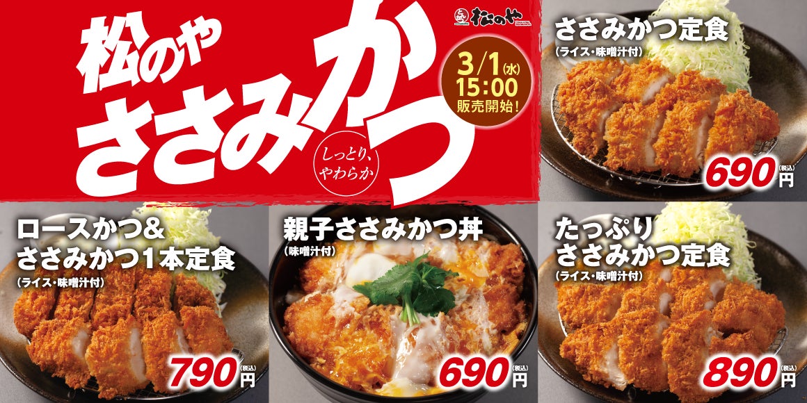 | 商品名 ささみかつ定食 690円 おろしポン酢ささみかつ定食 790円 味噌ささみかつ定食 790円 たっぷりささみかつ定食 890円 ロースかつ&ささみかつ1本定食 790円 ロースかつ&ささみかつ2本定食 990円 ささみかつ&海老フライ1尾定食 960円 ささみかつ&海老フライ2尾定食 1,230円 親子ささみかつ丼 690円 ささみかつカレー 690円 単品ささみかつ 230円 ※全て税込価格です。また、店内・お持ち帰りの税込価格は同一です。 ※お持ち帰りいただけます。お持ち帰りのみそ汁は、別途60円でお買い求めいただけます。 ※「ささみかつカレー」にはみそ汁は付きません。 ※「ささみかつカレー」は松のや・マイカリー食堂併設店舗での販売はいたしません。 発売日 2023年3月1日(水)午後3時~ 対象店舗 一部店舗を除く全国の松のや・松乃家 URL:https://bit.ly/3k63Jzm ※松屋併設店は3月8日より販売開始いたします。 ※沖縄県の店舗は販売価格が異なります。 |