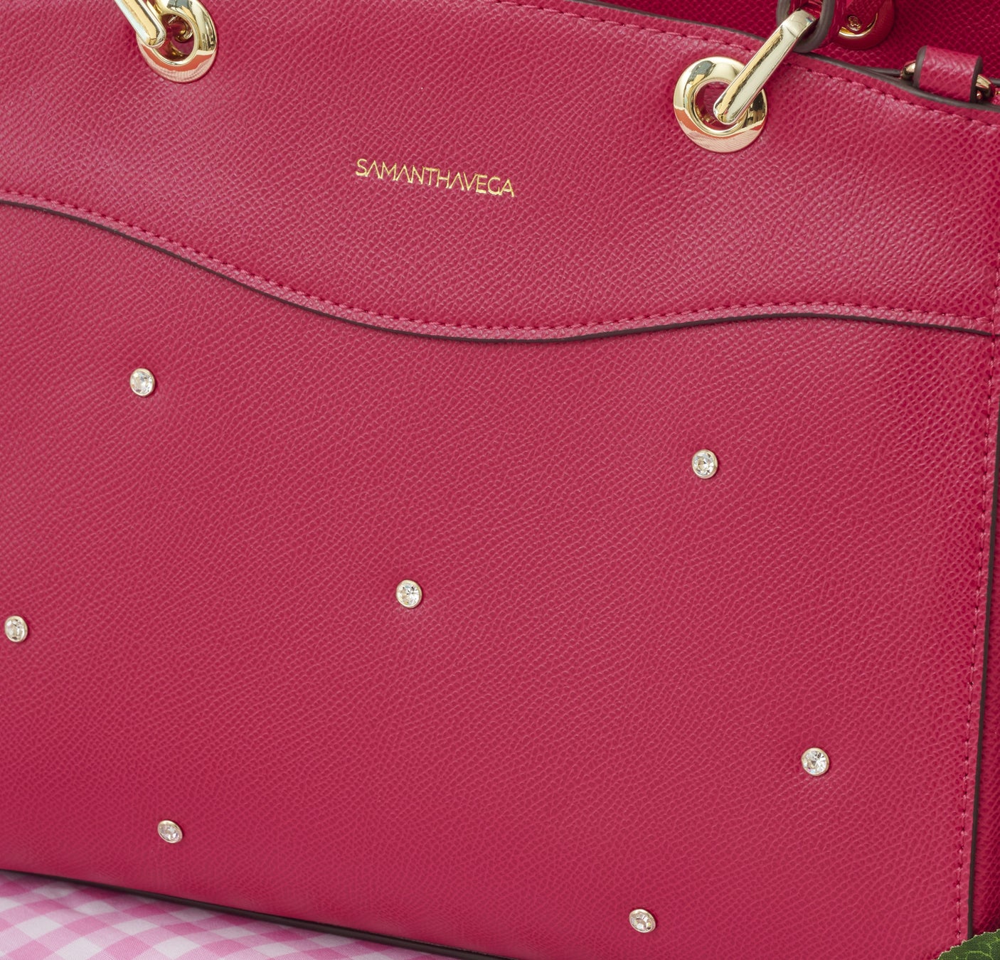 バッグのフロントには、イチゴの粒をイメージし、ビジューを散りばめたデザイン。