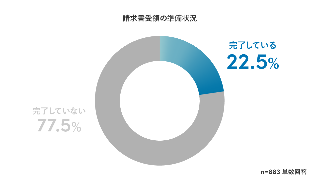 制度対応を進めていると回答した883名のうち、適格請求書の受領に関わる準備を「完了している」と答えた人はわずか22.5%にとどまっていることが分かりました。適格請求書発行事業者の登録申請数は2023年6月末時点で350万件を超えており、請求書を発行するための準備を進めている企業は多い一方、自社が受け取る請求書の処理に関する対応準備は遅れていることが明らかになりました。