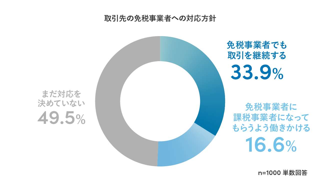 取引先の免税事業者への対応方針について聞いたところ、「免税事業者でも取引を継続する」は33.9%、「免税事業者に課税事業者になってもらうよう働きかける」は16.6%、「まだ対応を決めていない」は49.5%で、企業によって対応方針が分かれる結果となりました。