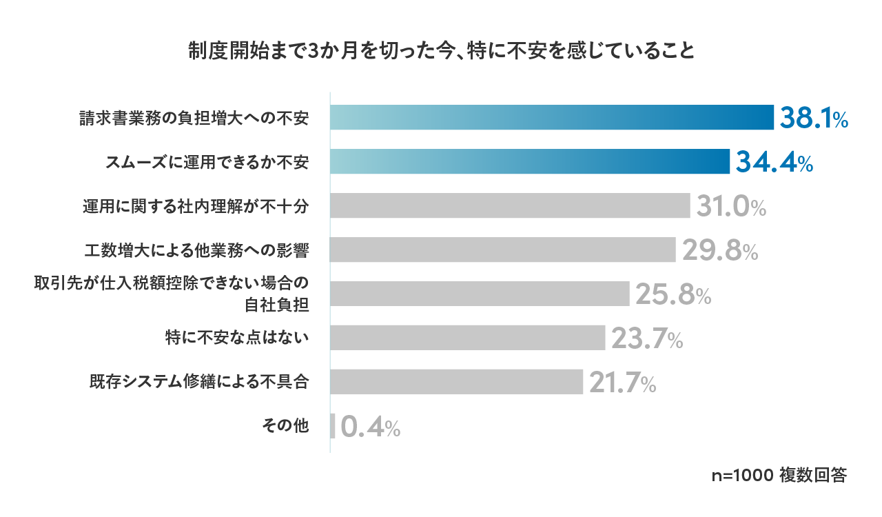 制度開始が迫る中、特に不安を感じていることの第一位は「請求書業務の負荷が増えること」(38.1%)、次いで「取引先とのやり取りや請求書形式の変更により円滑に運用できるかどうか」(34.4%)という結果でした。