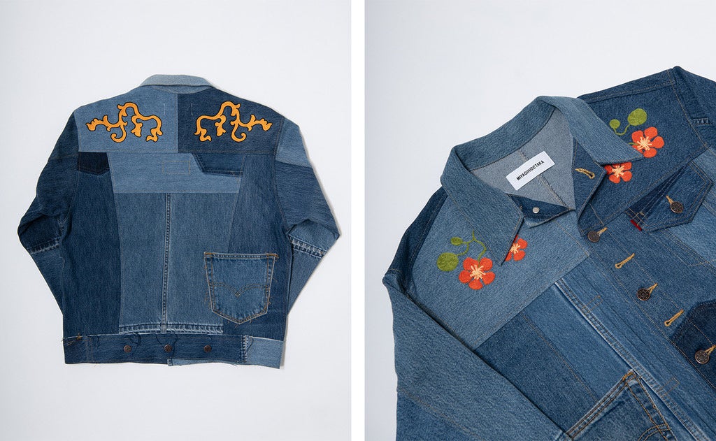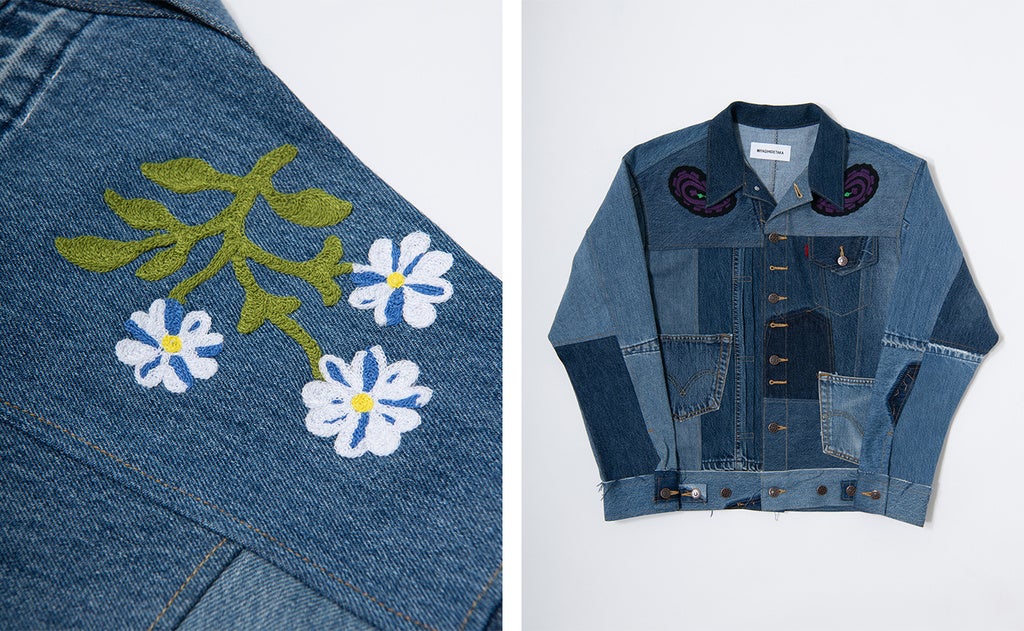 デニムを解体し、再構築したジャケットと刺繍のコラボレーションは全て1点ものとなっております。
