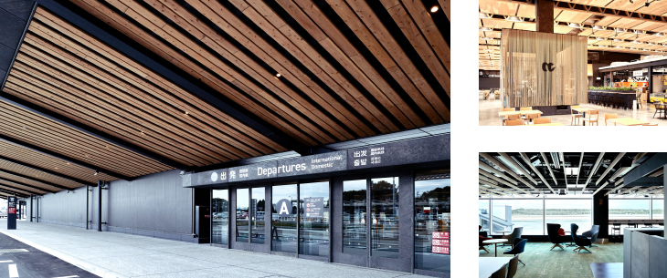 阿蘇くまもと空港の外観・内装は熊本城をデザインモチーフとして設計され、熊本城の黒漆や漆喰、石垣、そして阿蘇の火山岩など、地域を象徴する素材をイメージさせるデザインになっているほか、熊本や九州の木材もふんだんに使用されています。こういった素材をモダンなデザインで表現することにより、魅力あふれる地域のアイデンティティがいっそう広く伝わるよう工夫しています。