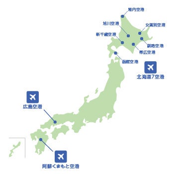 北海道エリアでは、道内にある全13空港のうち、新千歳・稚内・釧路・函館・旭川・帯広・女満別の7空港をコンセッションしています。