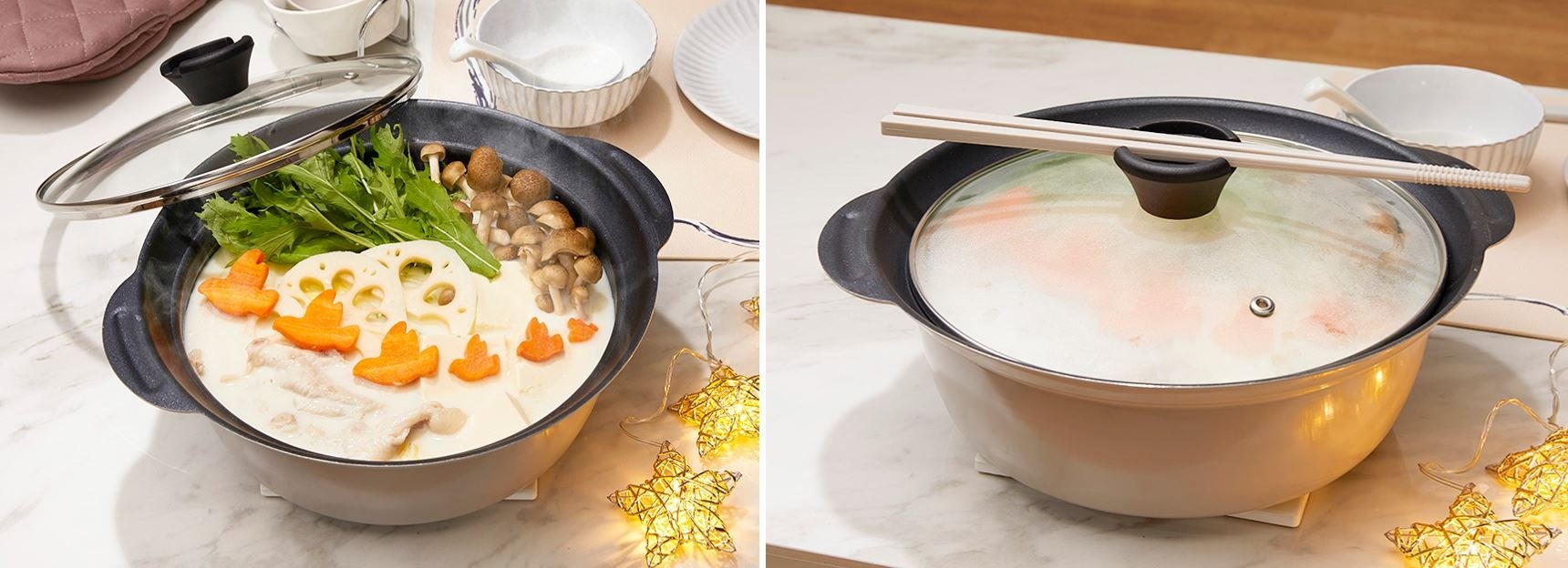 ◆ふちが高いのでふきこぼれにくく、軽くて持ち運びが楽なモカカラーのアルミ鍋。蓋の持ち手部分に菜箸を仮置きできるのも便利です。
