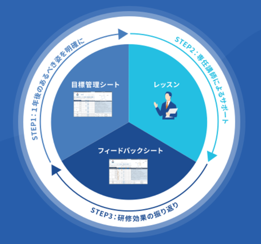 ビジネスにおいて1年後のあなたの姿を受講者、研修担当者、講師が共有しレッスンを進めて参ります。