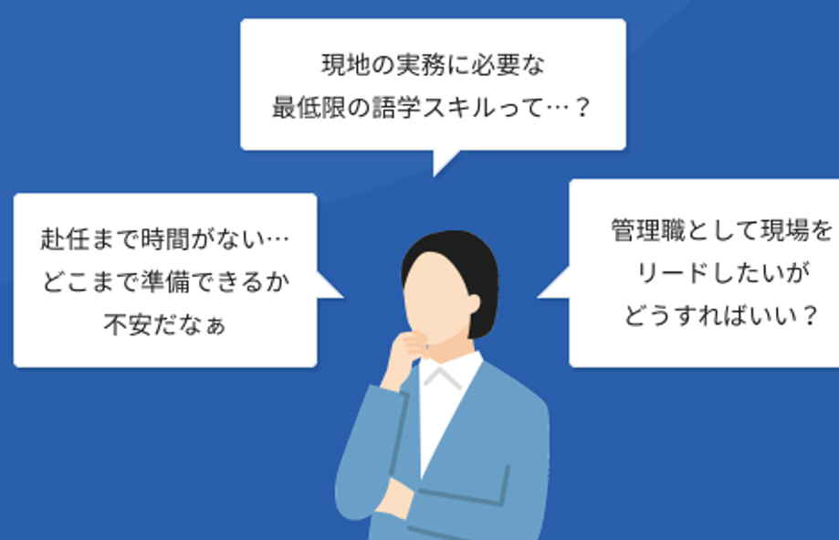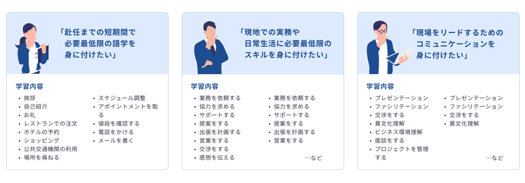 海外赴任に必要な「語学力」と「グローバル人材スキル」を一気通貫で習得できるようサポートします。