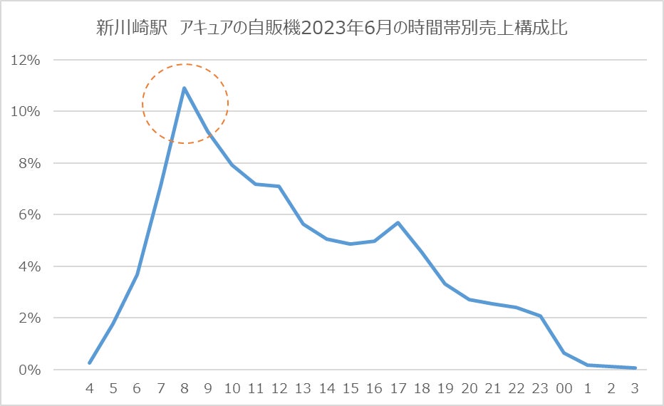 ・当社では2022年10月に田町駅と代々木駅、2023年7月に新川崎駅と豊田駅で、アキュアの自販機をキャッシュレス専用としており、中でも新川崎駅ではキャッシュレス専用化後も、売上が前年比を大きく上回り好調です。その要因を「住宅地」、「オフィス・工場エリア」という特徴から、出勤時にアキュアを利用いただくお客さまの認知が高まったため、と分析しています。