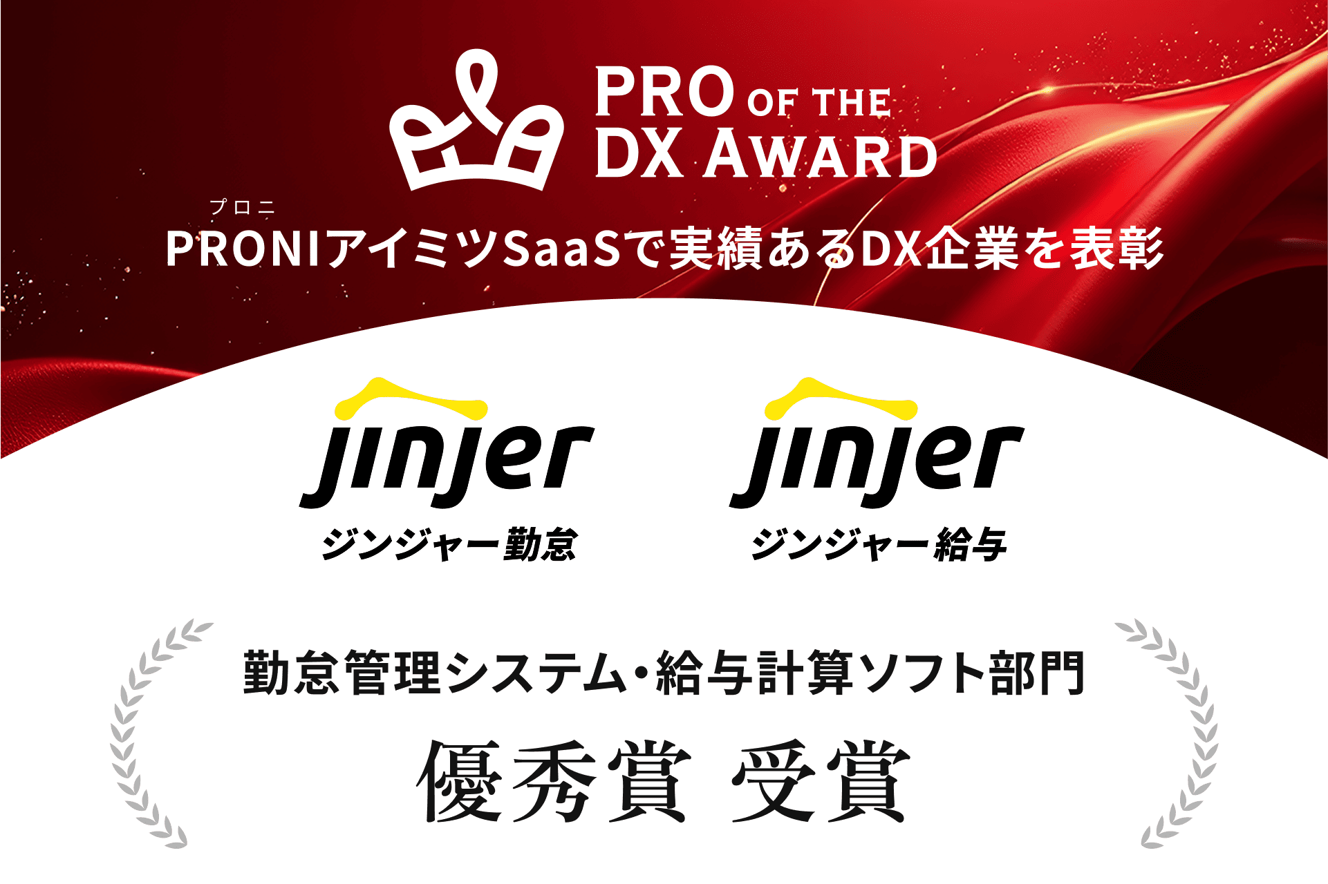 統合型人事システム「ジンジャー」を提供しているjinjer株式会社(本社:東京都新宿区 代表取締役社長CEO:冨永 健)は、PRONI株式会社(本社:東京都品川区 代表取締役CEO:柴田 大介 以下「PRONI」)が主催する「PRO of the DX Award 2025(上期)」の勤怠管理システム部門・給与計算ソフト部門にて、それぞれ「ジンジャー勤怠」と「ジンジャー給与」が優秀賞を受賞したことをお知らせします。