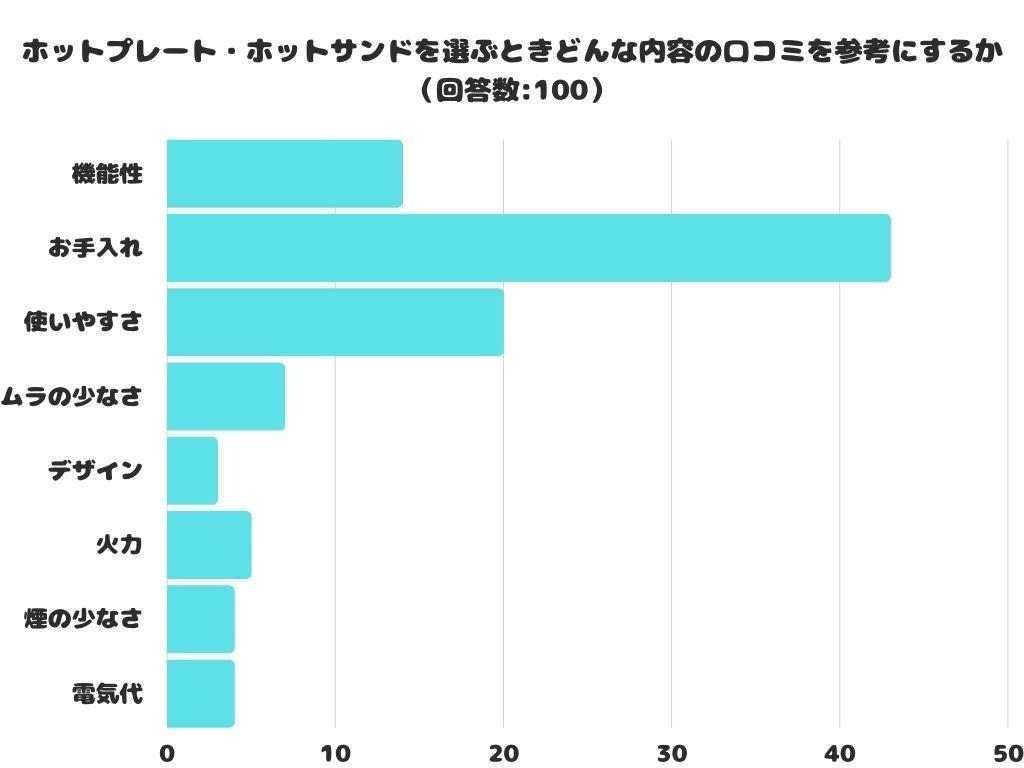 ホットプレート・ホットサンドのどんな内容の口コミを参考にするかをアンケートにて調査したところ、1位は「お手入れ」でした。