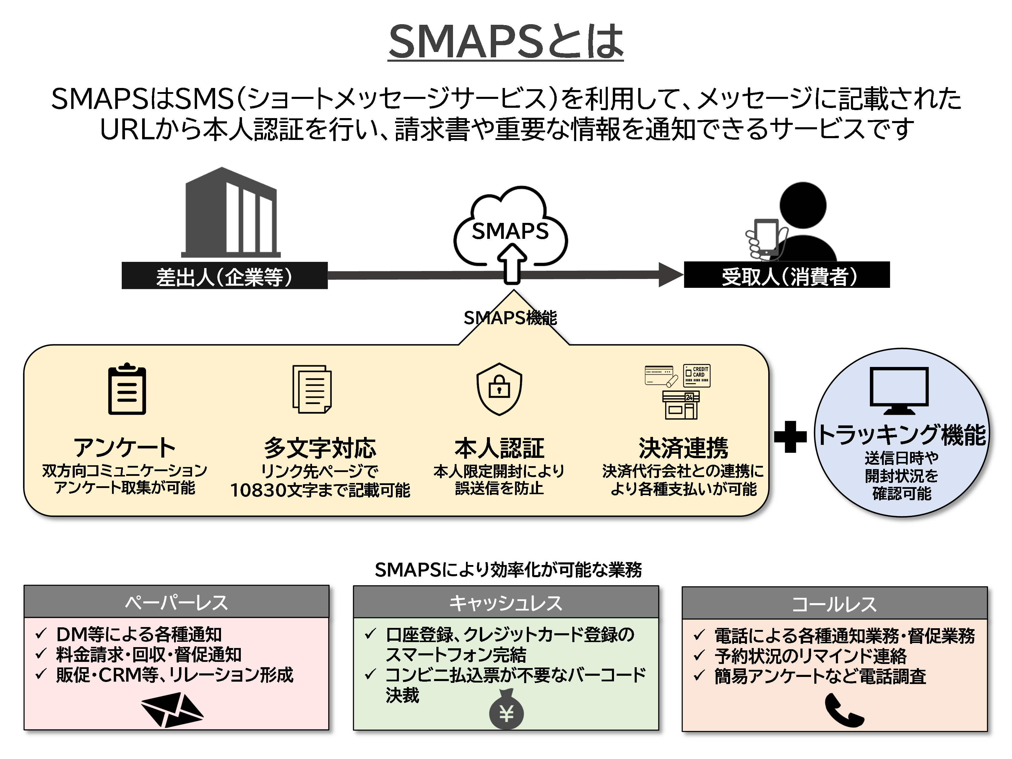 具体的には、「契約解除通知、未払金督促、損害賠償請求等に利用される内容証明郵便をはじめとした特殊取扱郵便の発送業務」、「請求、決済などの支払いに関わる業務」、「本人認証、重要事項説明、クーリング・オフ等契約に関わる一連の通知業務」、さらには、「パンフレットやマニュアルの送付、注文内容の確認、工事のリマインド等、カスタマーサービスに関わる通知業務」等、書類発送により行われている多様な業務を「SMAPS」の配信に切り替え、ペーパーレス社会の実現や企業等の業務効率化を通じた働き方改革の実現に寄与してまいります。