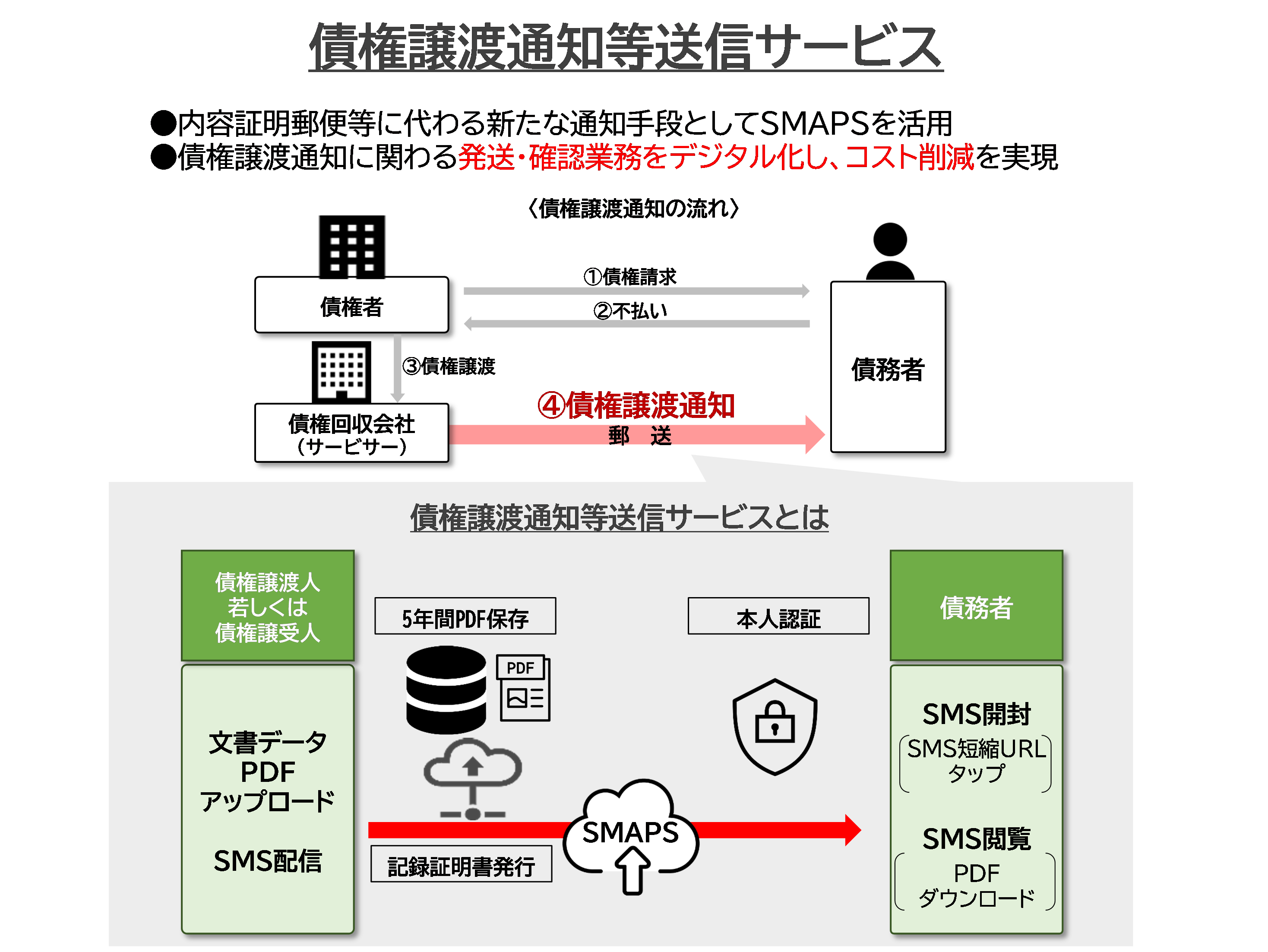 経済産業省および法務省から「債権譲渡の通知等に関する特例に関わる新事業」として認定を受けた「債権譲渡通知等送信サービス」を「SMAPS」の新たな機能として提供することを通じ、内容証明郵便や未払い債権の回収に関わる督促状、受任通知等に関わる書面の発送を「SMAPS」の配信に置き換えることで、債権回収業務のDXを実現します。