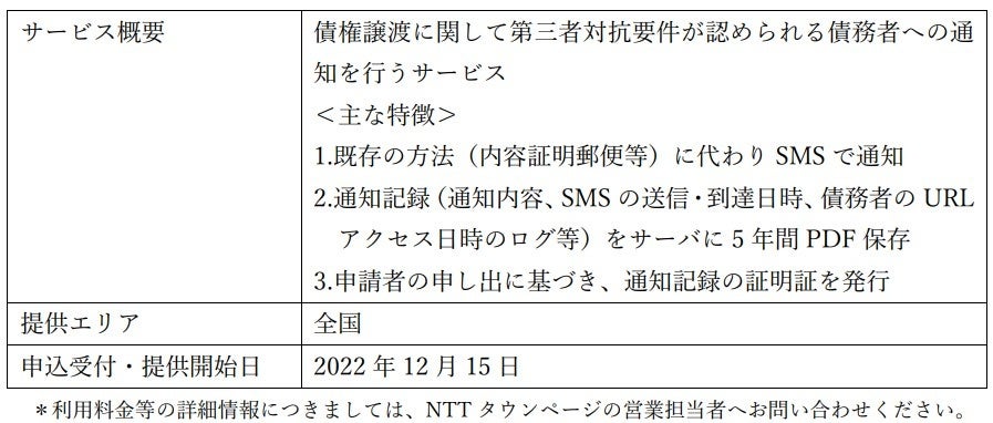 この取り組みの第一弾として、経済産業省および法務省から国内で初めて「債権譲渡の通知等に関する特例に関わる新事業」として認定を受けたSMSを活用した「債権譲渡通知等送信サービス」を「SMAPS」の新たな機能として2022年12月15日よりリンクスから提供開始し、NTTタウンページにおいて取り扱います。
